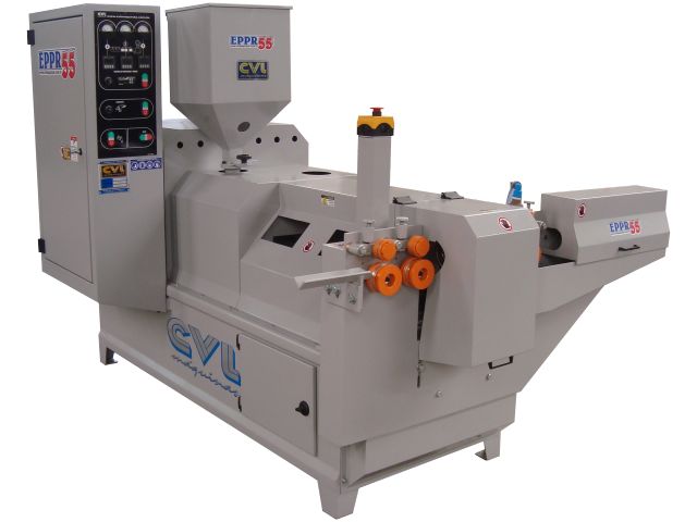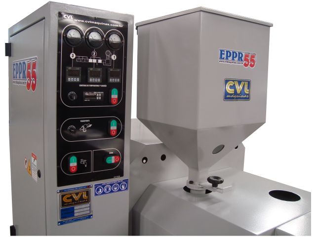Aplicação A Extrusora de Polietileno é uma máquina projetada para efetuar com desempenho e qualidade o revestimento em polietileno com uma cor, em perfis redondos de vários diâmetros. Utilizada em larga escala na plastificação de cabos de vassoura, componentes de berços infantis, entre outros.