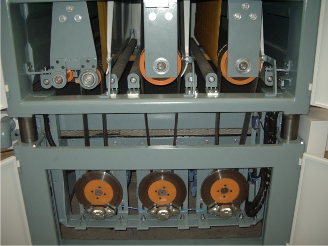 Principais Características • três grupos lixadores • sistema de segurança em caso de rompimento ou deslocamento lateral das lixas • esticamento pneumático das lixas • bitolador de espessura da peça • oscilação pneumática das lixas por sensor • rolos pressionadores emborrachados • roletes de apoio na entrada e saída da mesa • centralizador automático do tapete transportador • velocidade do tapete transportador variável eletronicamente